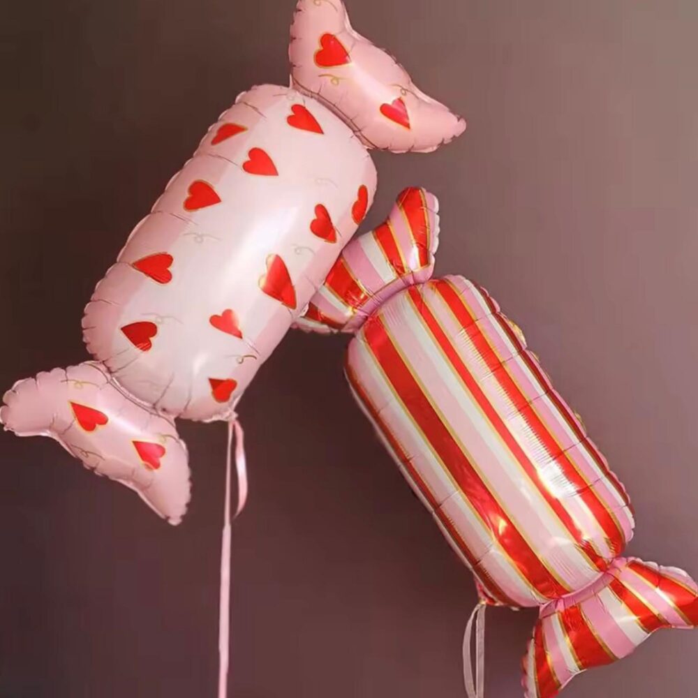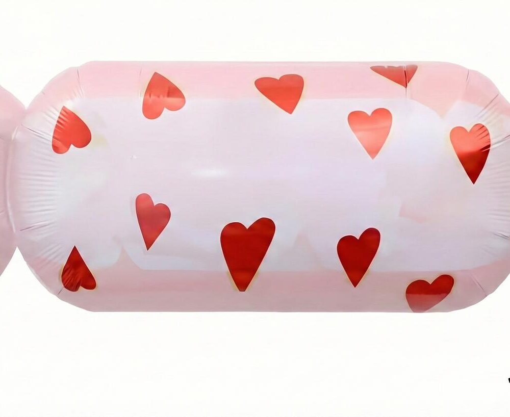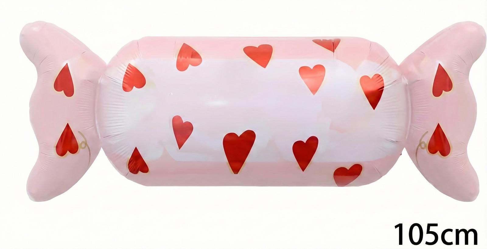 בלון מיילר סוכריית אהבה בגודל 105 ס"מ – בלון מיוחד ומרשים, עם עיצוב סוכרייה חמוד בצבע ורוד ועליה לבבות אדומים.