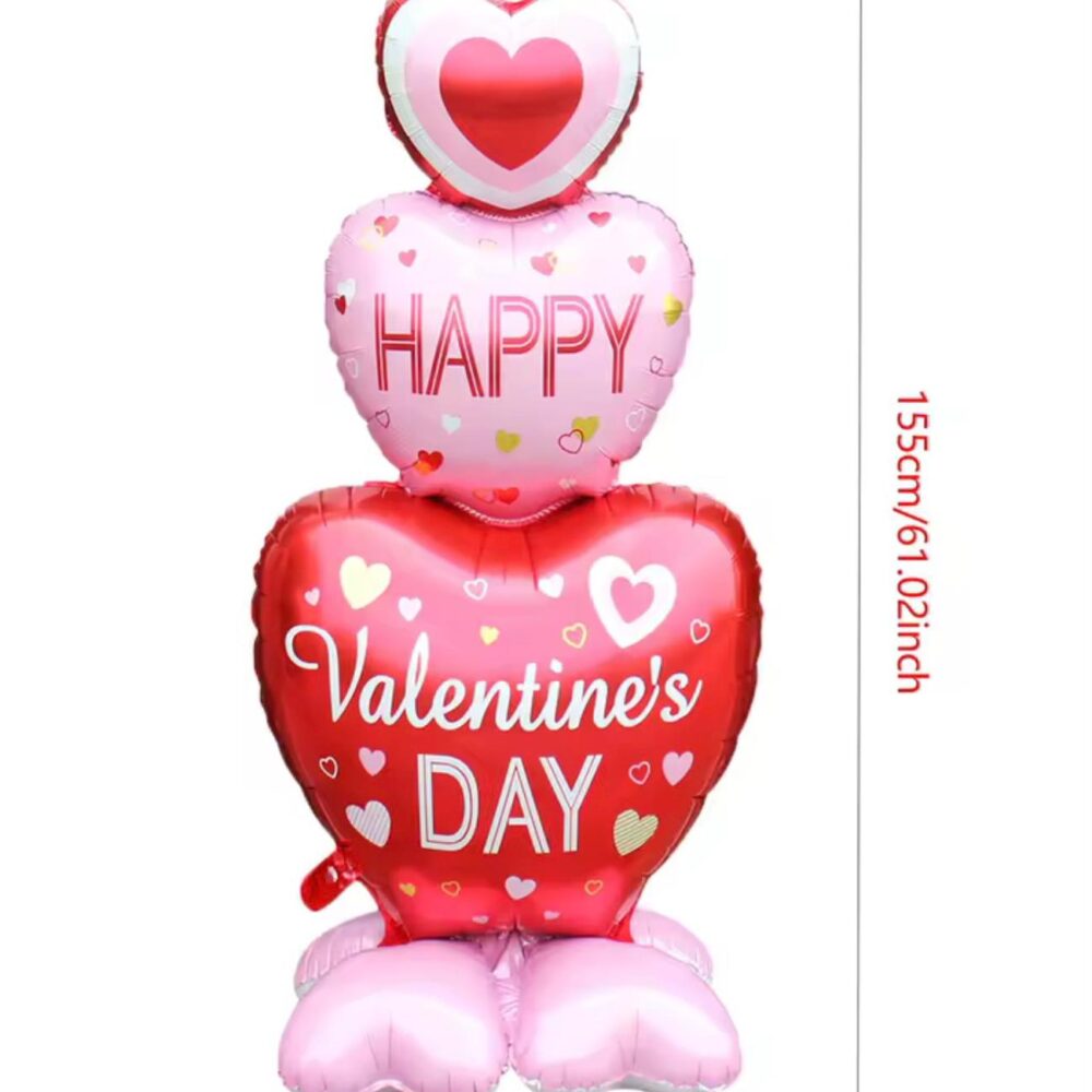 בלון מיילר סטנד בגובה 155 ס"מ, עיצוב לבבות צבעוניים עם כיתוב "Happy Valentine's Day". קישוט מושלם ליום האהבה.