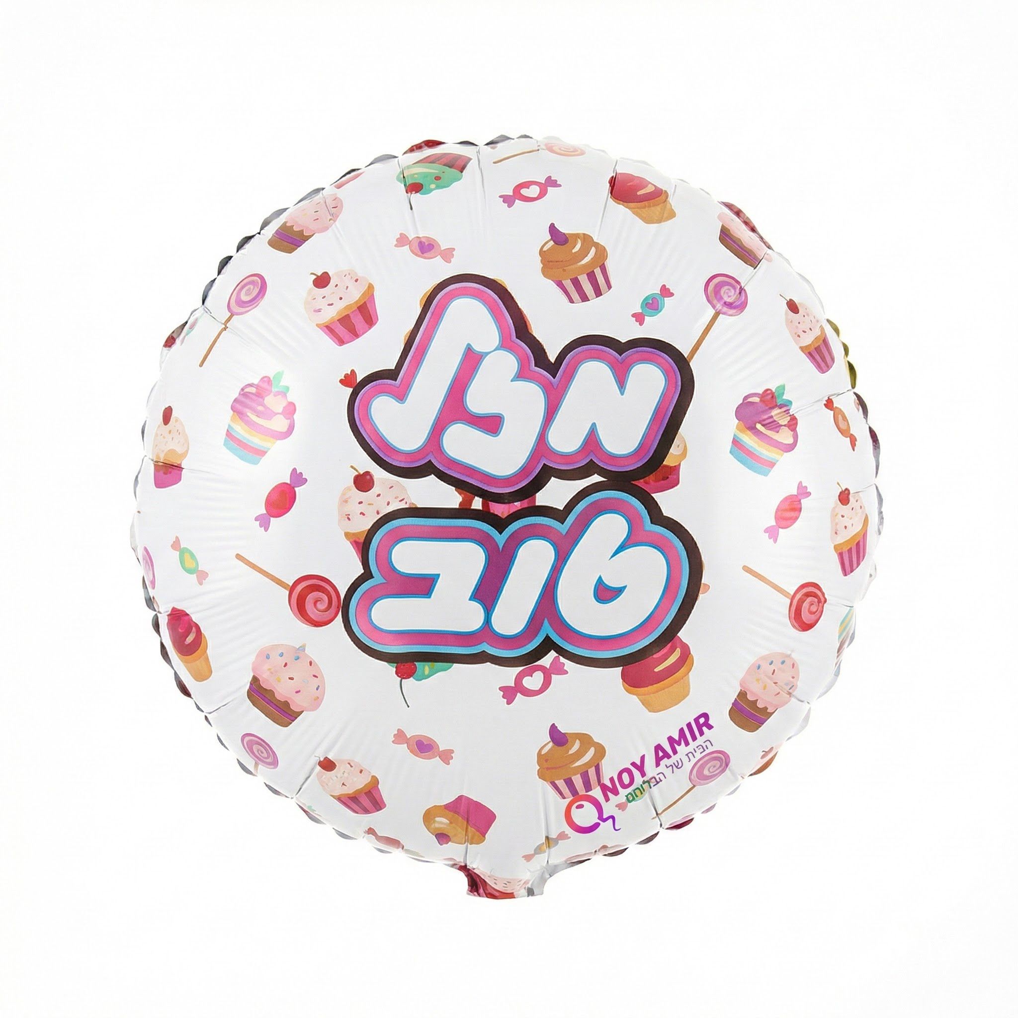 בלון מיילר עגול 18 אינץ׳ בצבע לבן עם הכיתוב "מזל טוב" ועיטורי קאפקייקס, סוכריות ומתוקים צבעוניים.