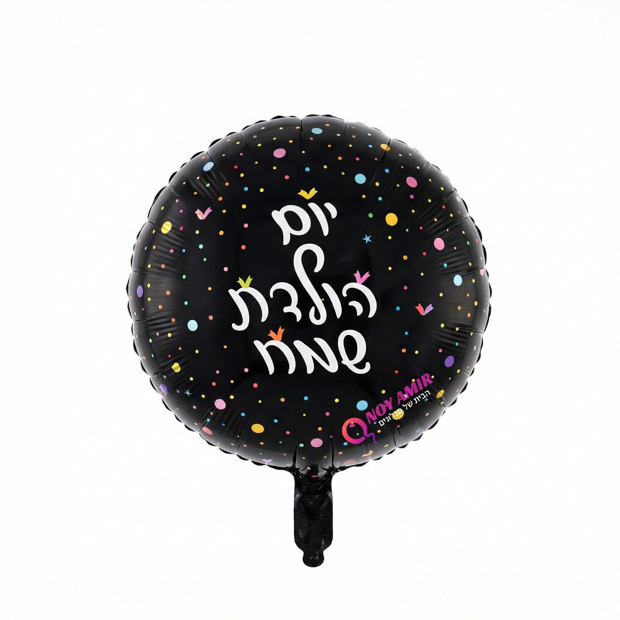 בלון מיילר עגול 18 אינץ׳ בצבע שחור עם הכיתוב "יום הולדת שמח", מעוטר בנקודות צבעוניות ואיורי כתר קטנים היוצרים מראה חגיגי ואלגנטי.